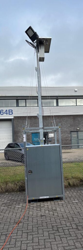 De beveiligingsmast van BS Security is na plaatsing binnen enkele uren operationeel. Met de mobiele internetverbinding is alleen een stroomaansluiting voldoende, Zonder stroom kan hij nog 24 uur werken en doormelden.